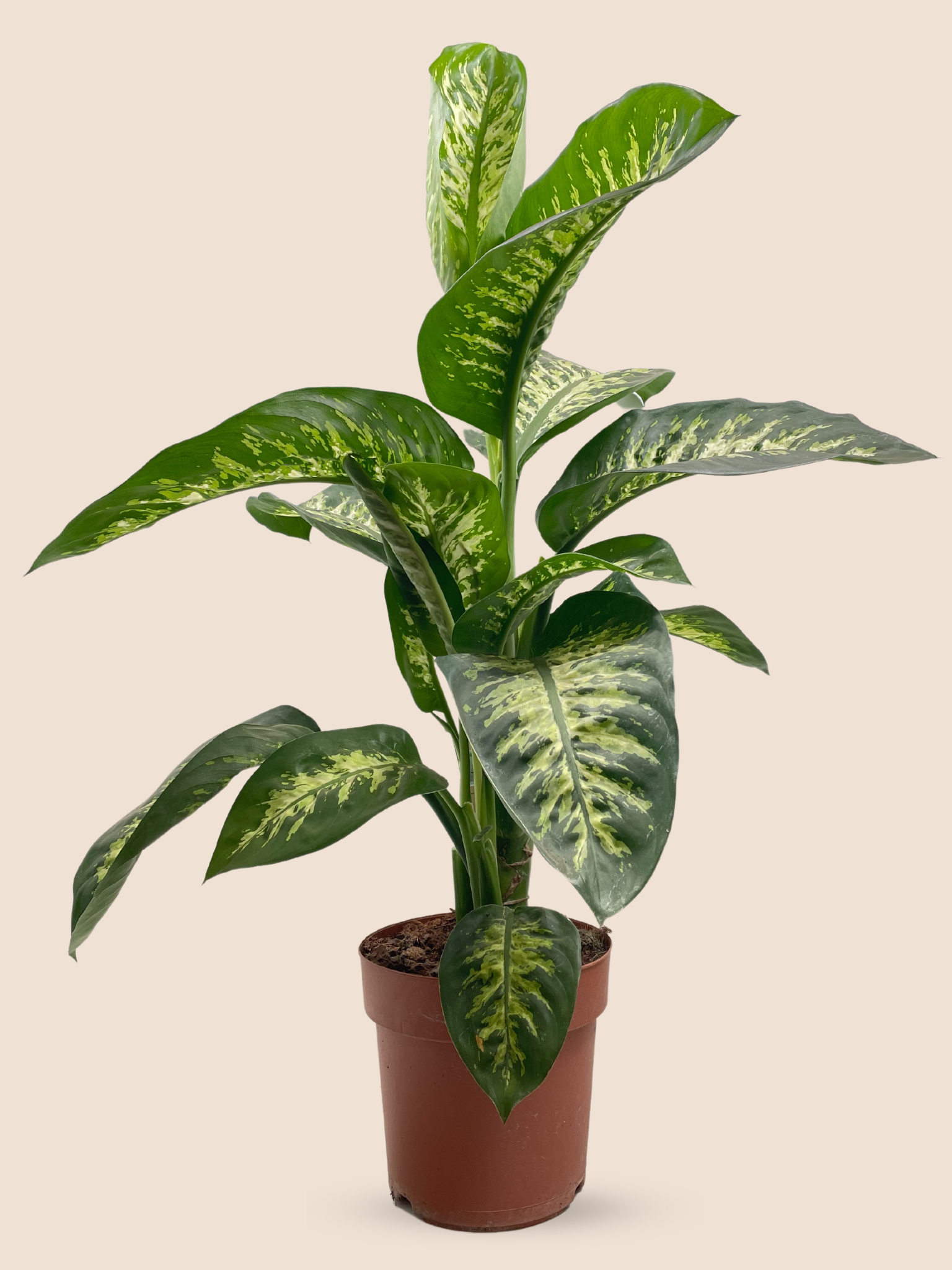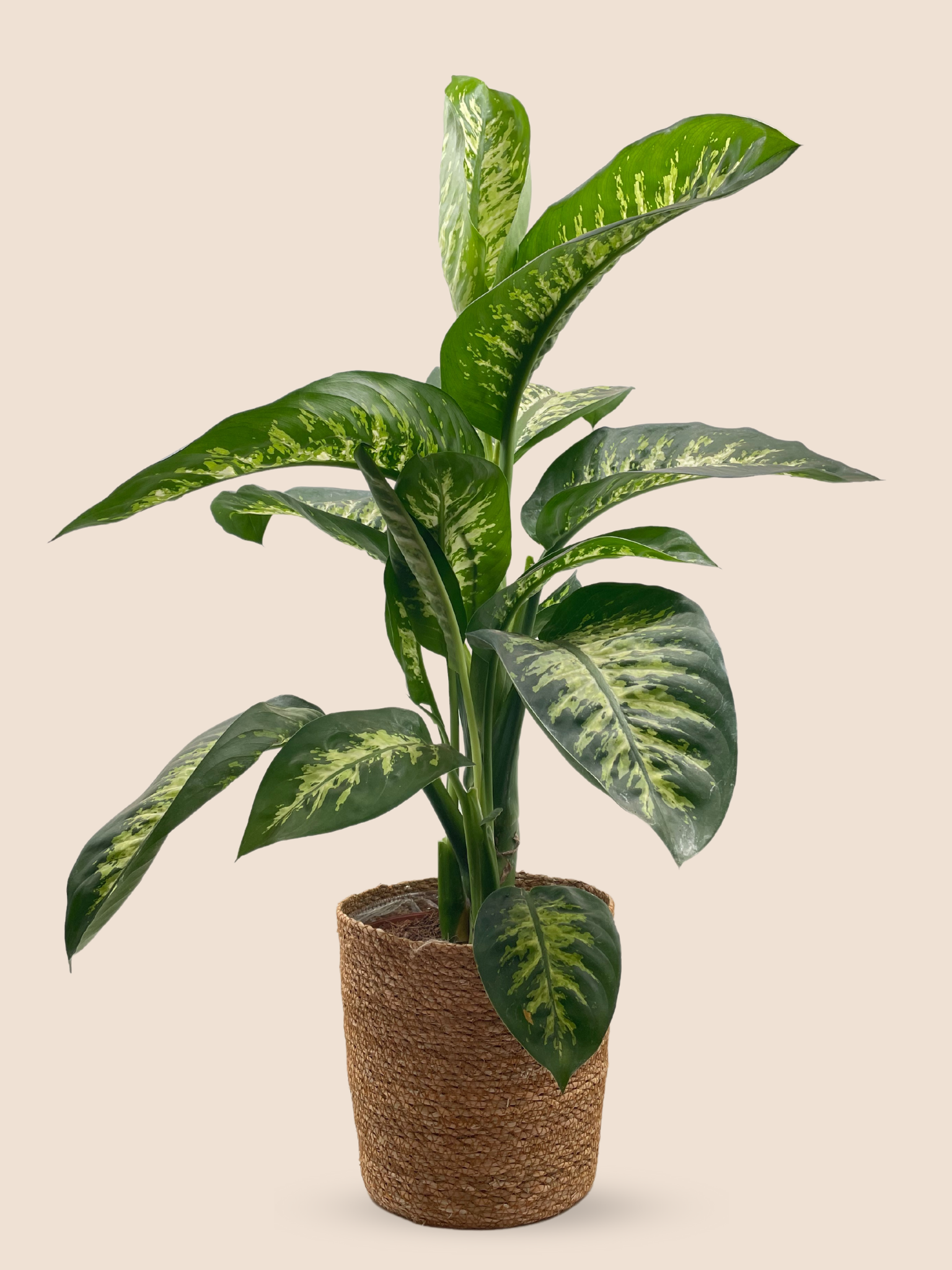 This is a beautiful and easy-going plant that does not require much maintenance and survives in almost any spot around the house because it can tolerate lower lighting, making it the perfect choice for home or office. Water it regularly (once a week) allowing the soil to dry a little before watering it again. It is best to have it away from pets. Fertilizing it once in a while during the growing process helps the Dieffenbachia to stay strong and healthy. For the well-being of the plant we do not recommend you to keep it in a room where the temperature goes below 15° Celsius.